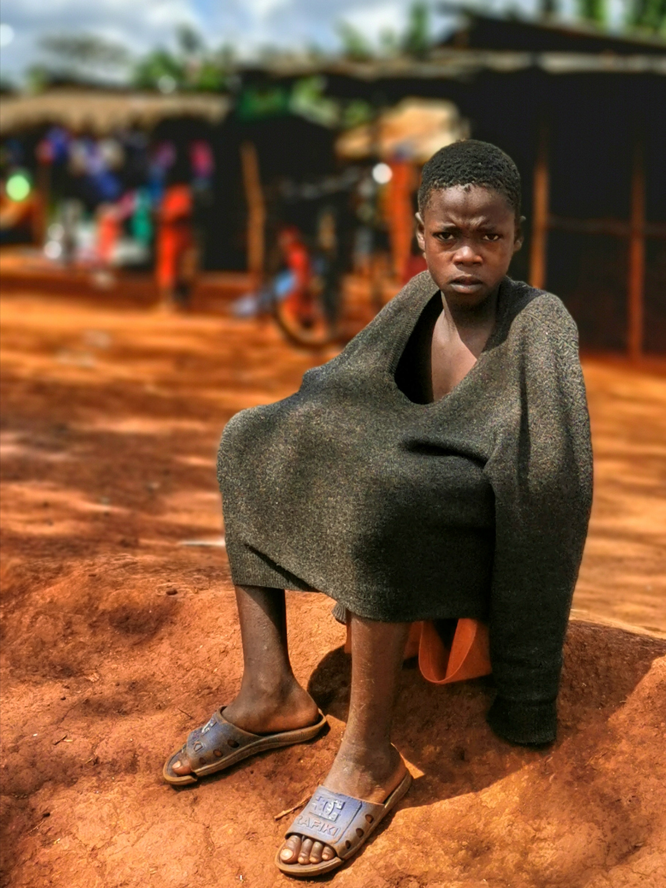 When I was in zone 1 of village C1 in a popular place called "stand" located on the main road, which crosses the camp between zone 1 and zone 11, I was surprised to see a child who wrapped in his clothes.