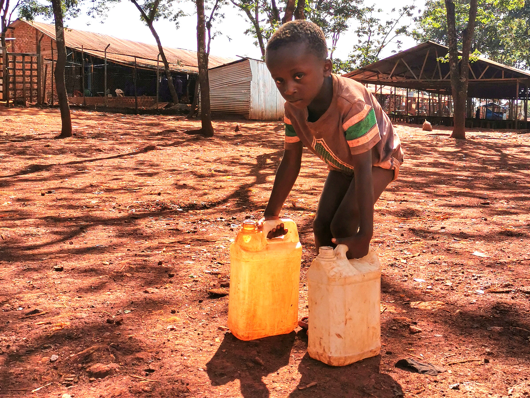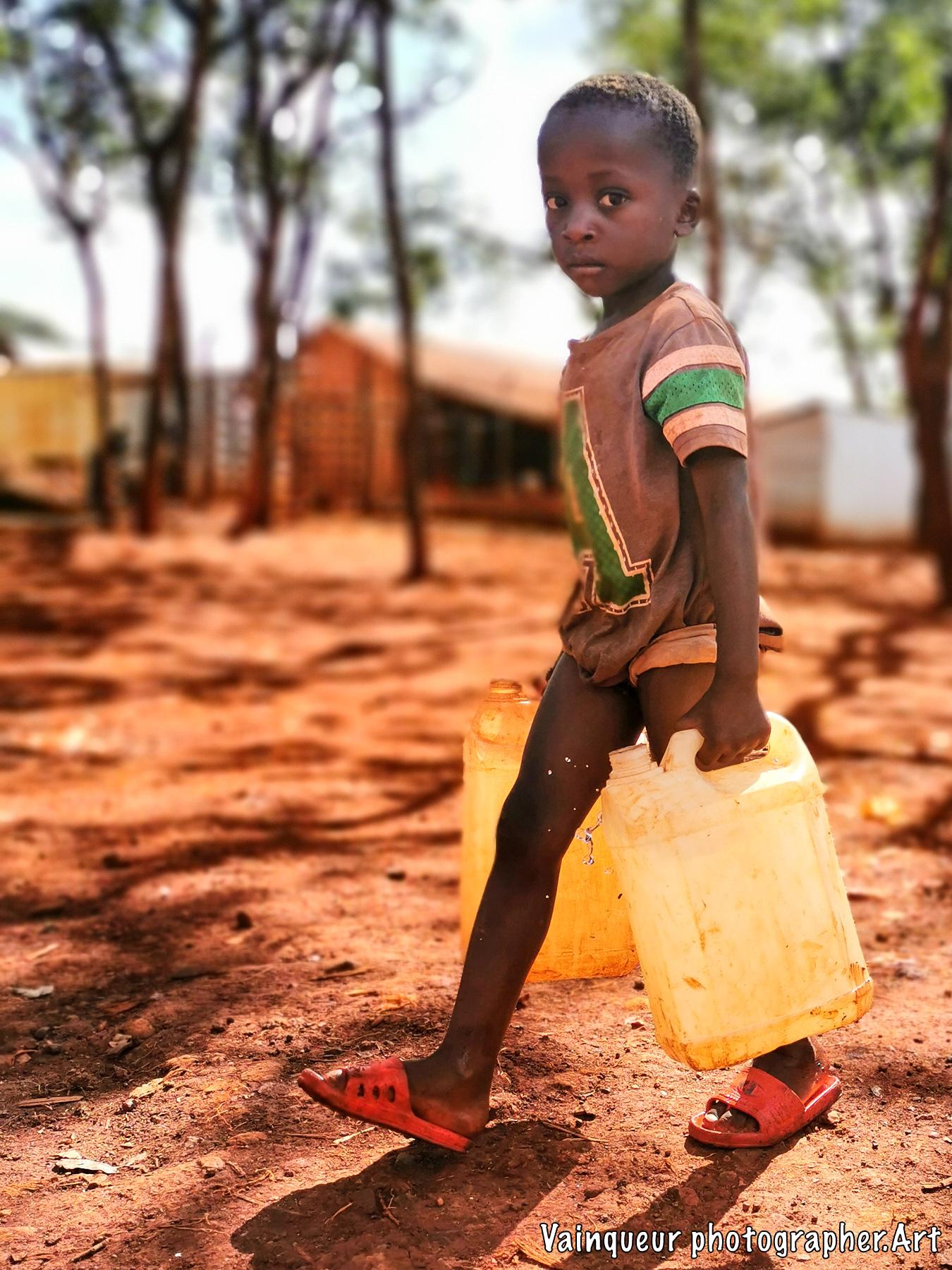 This little boy is coming from the pump which is a few meters from his home. This brave little boy has taken care of the water while his sisters went to the WFP depot to receive food and his brothers went to school. So this boy has gone to bring the water.