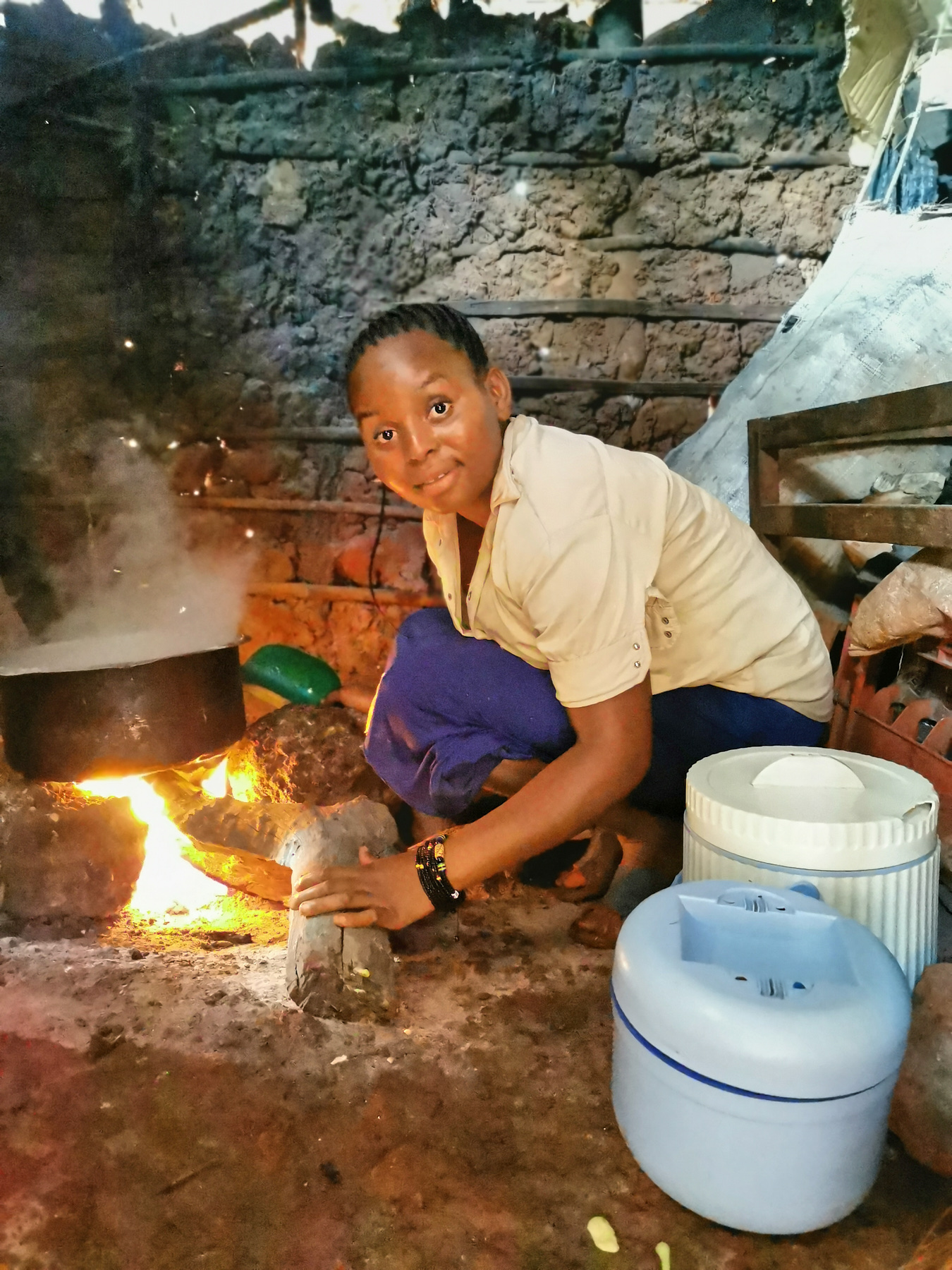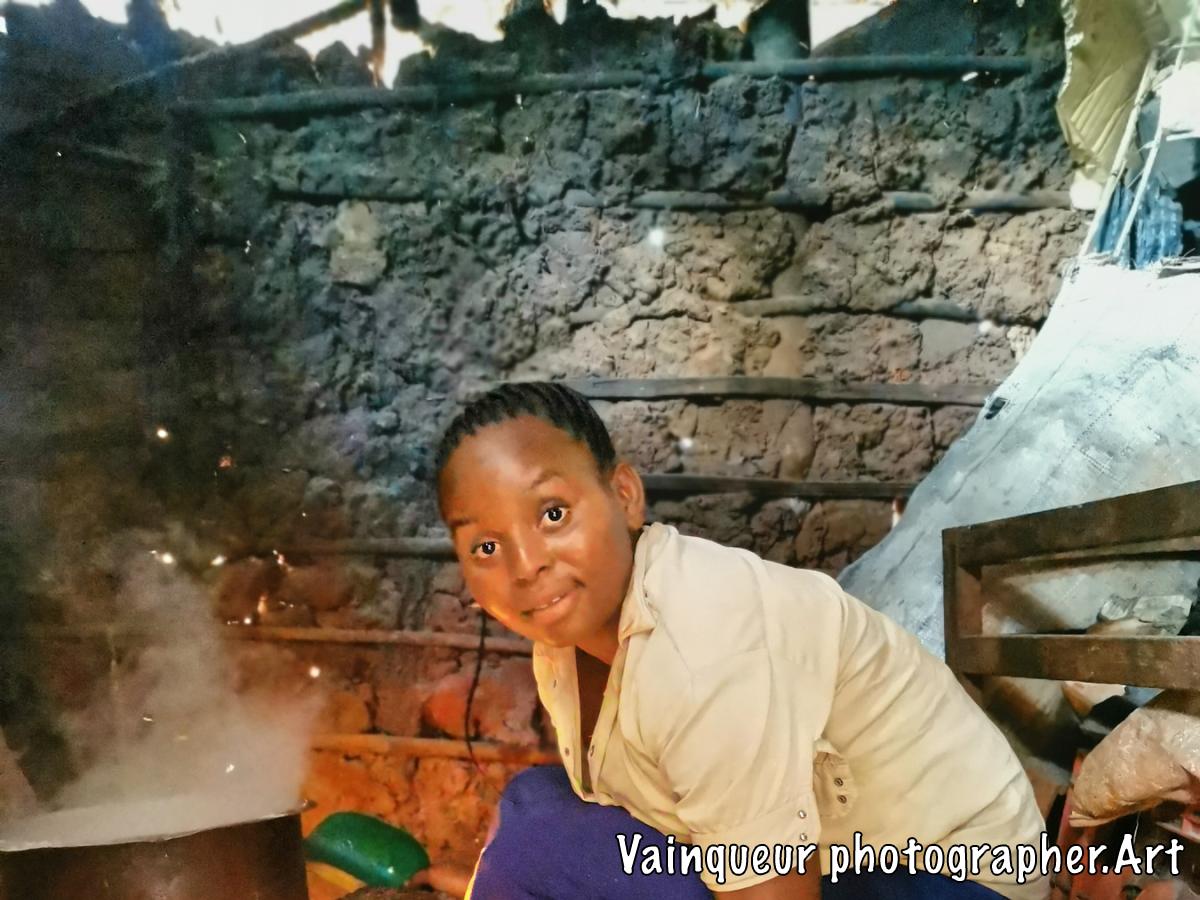 In this picture, Marceline is sitting in their kitchen and preparing lunch. After that, she will go to the tap to draw water like she does every morning.
