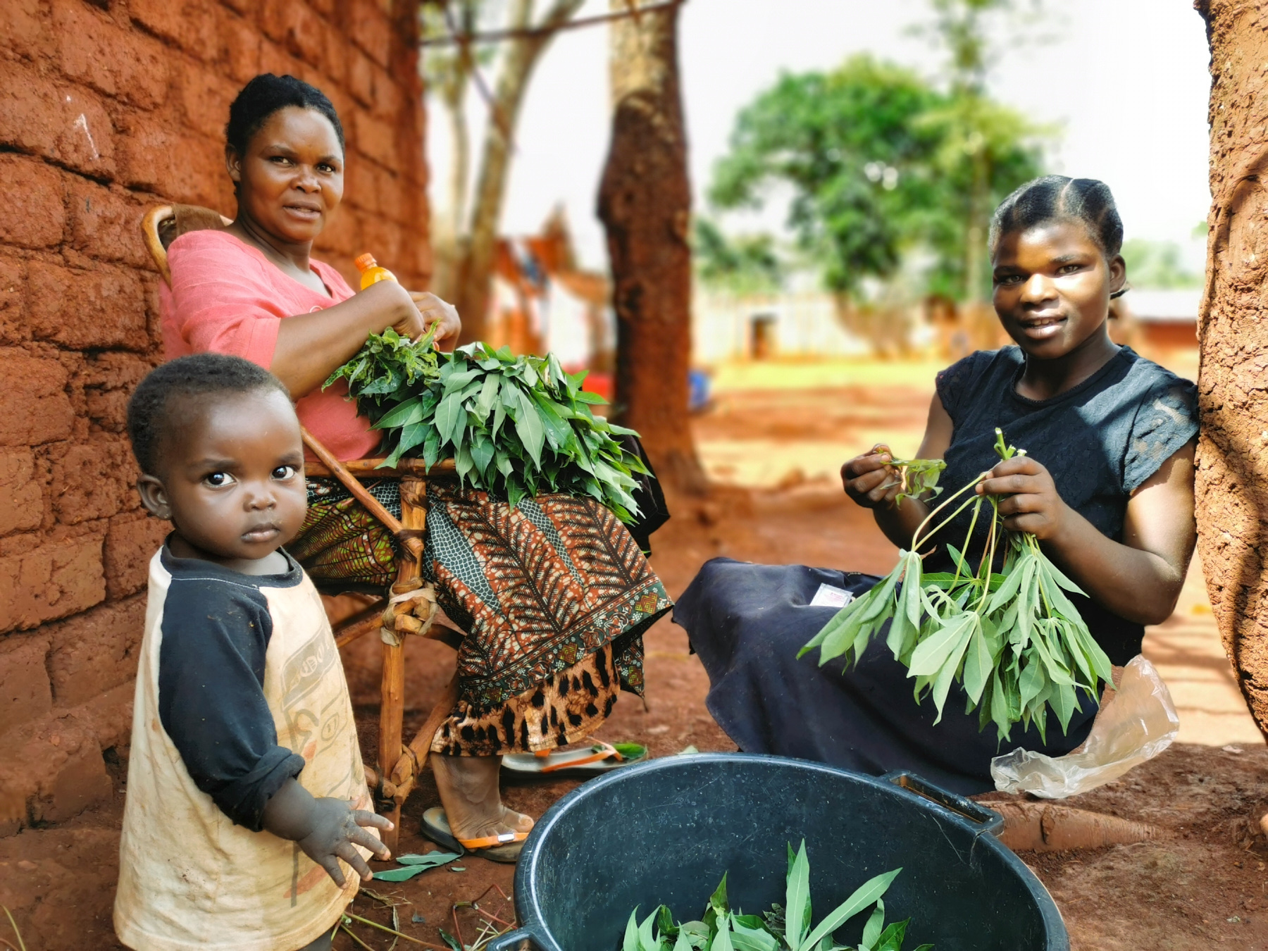 This woman and her daughter prepare the leaves of the cassava plants for their afternoon and evening meals after having drunk the mixture of salt for lack of sugar.