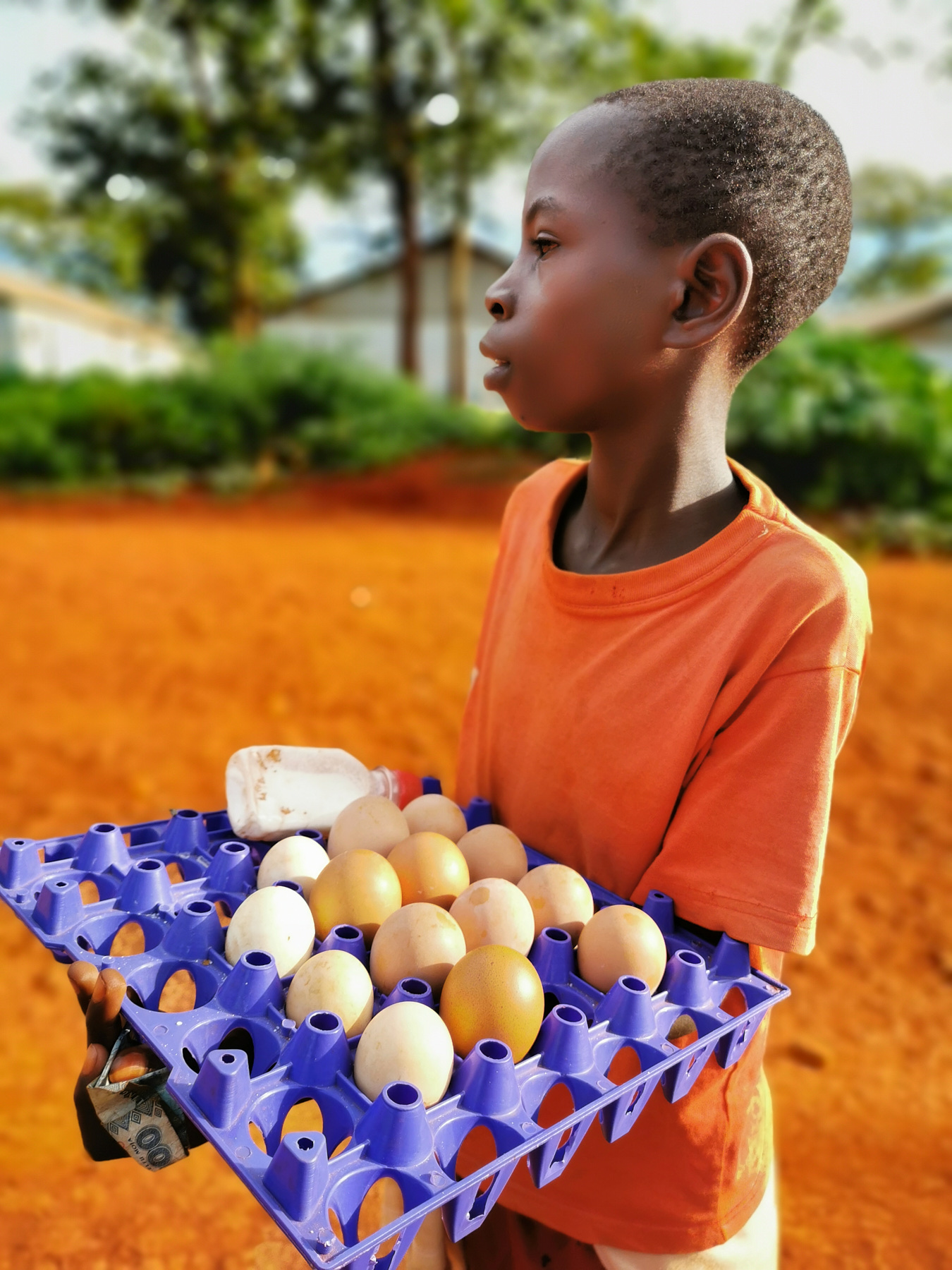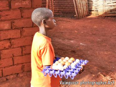 While the children are at home to respect the rule against the spread of viruses this child takes advantage of the time to sell eggs in the street of Nyarugusu. This boy sells an egg for 500 shillings, since the morning he goes around the camp with his goods. His small profit must help him to achieve his needs during this closure of the schools, he told me.