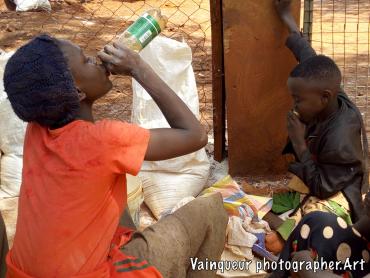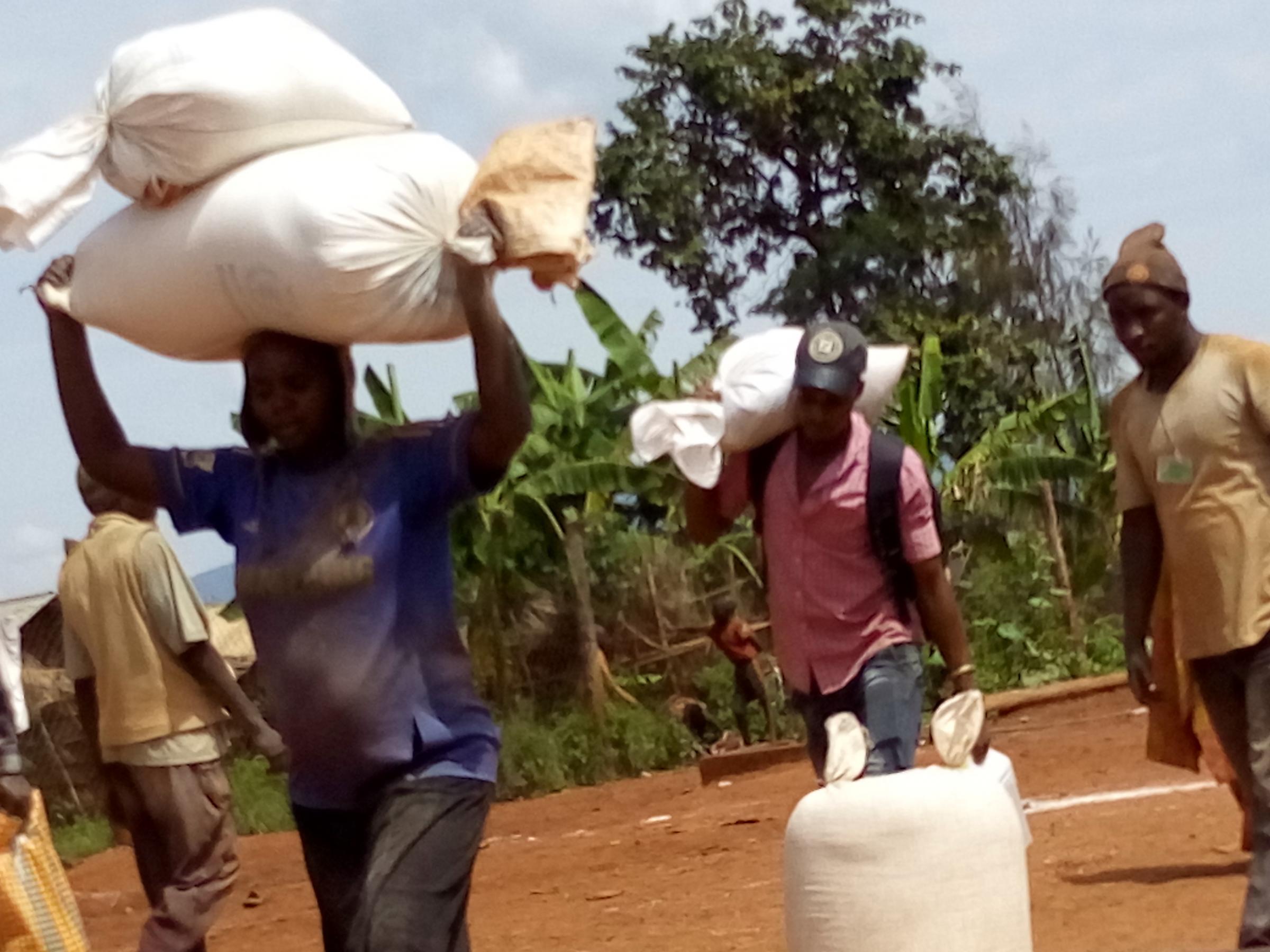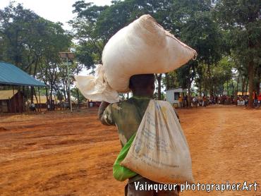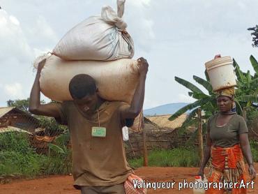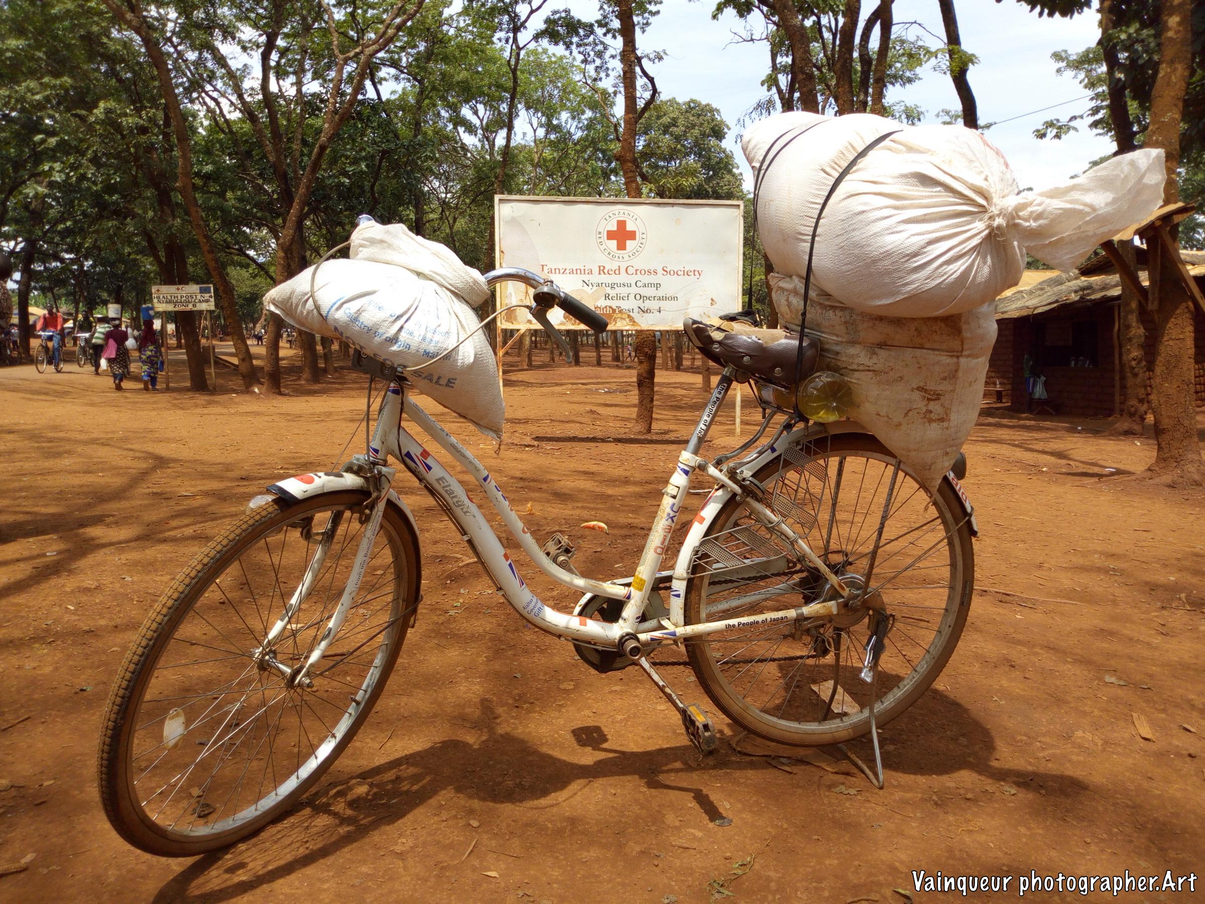 The refugees say (UNHCR ndo baba wetu) which means UNHCR is our father. Why do refugees want this? Here at the camps UNHCR is the father is a slogan is popular because UNHCR is the United Nations High Commission for Refugees. They're helping the refugees here at the camps and resettling to the country of the West. The refugees each month receive the food. They do not know where the food comes from but he discovers the logos in the bags like: USaid, WFP and others all this comes from the WFP (world food programm) repository with the UNHCR logos. The refugees do not try to understand where the food comes from but they say thank you UNHCR who are their father for taking care of them. On the distribution days each family is presented to the depot according to the criteria and to transport food to the home some use their physical strength and others the bikes to transport the parcels. We were surprised to see a man carrying the package in front and his wife is behind carrying the baby on.