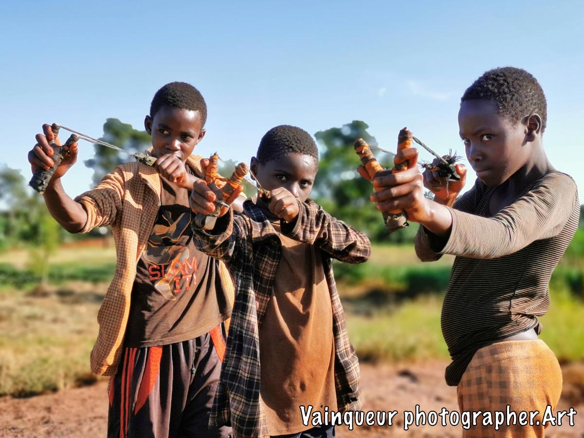 These small young hunters are from the bordering village of the Kichiba, their hunting is done on the birds which come to look for and eat the small fish in the stagnant water and those which make the nests in the in the Kichiba and around.